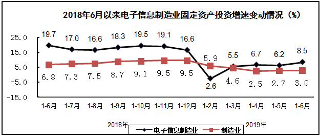 上半年,电子信息制造业固定资产投资同比增长8.5%,增速同比回落11.2个百分点,比1-5月提高2.3个百分点。