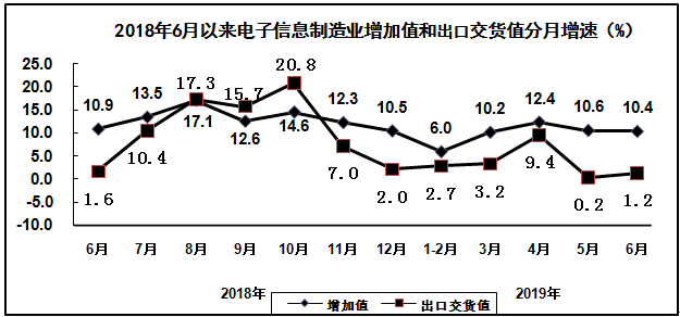上半年,规模以上电子信息制造业增加值同比增长9.6%,增速比去年同期回落2.8个百分点。6月份增加值同比增长10.4%。
