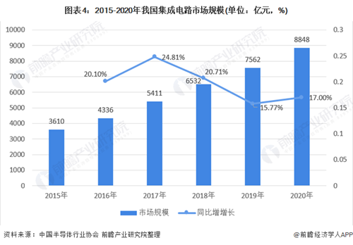 根据中国半导体行业九州网_九州(中国)数据显示,2015-2020年我国集成电路市场规模呈逐年增加趋势。2020年我国集成电路市场规模为8848亿元,较2019年增加17.00%。